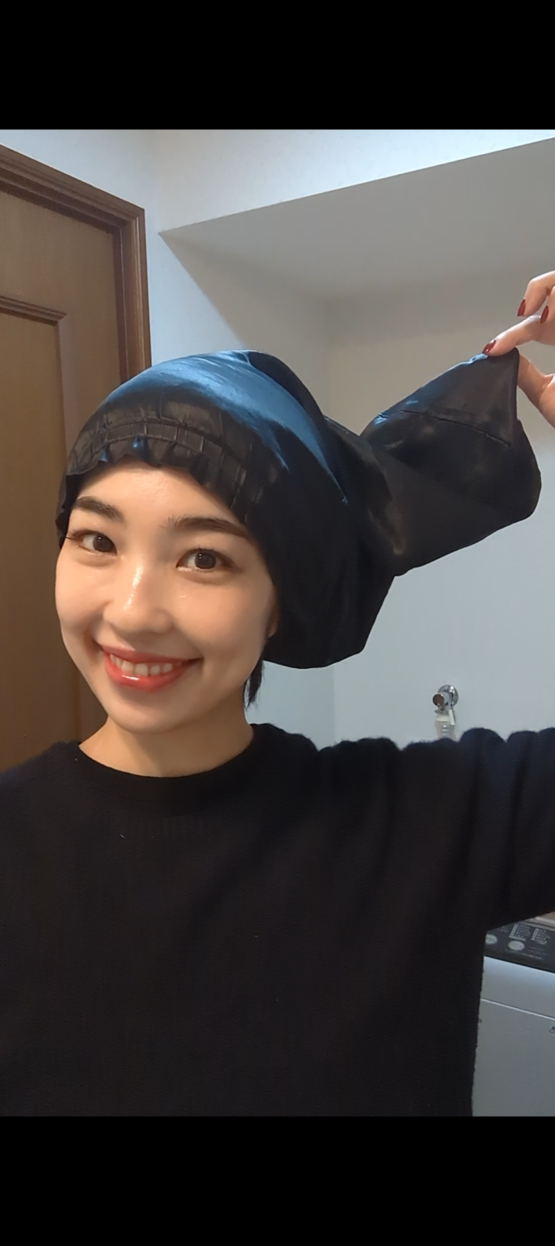 戴着这个(丝绸睡帽)睡觉的话,睡翘的情况当然减少了,而且头发有了光泽,也变得顺滑了。